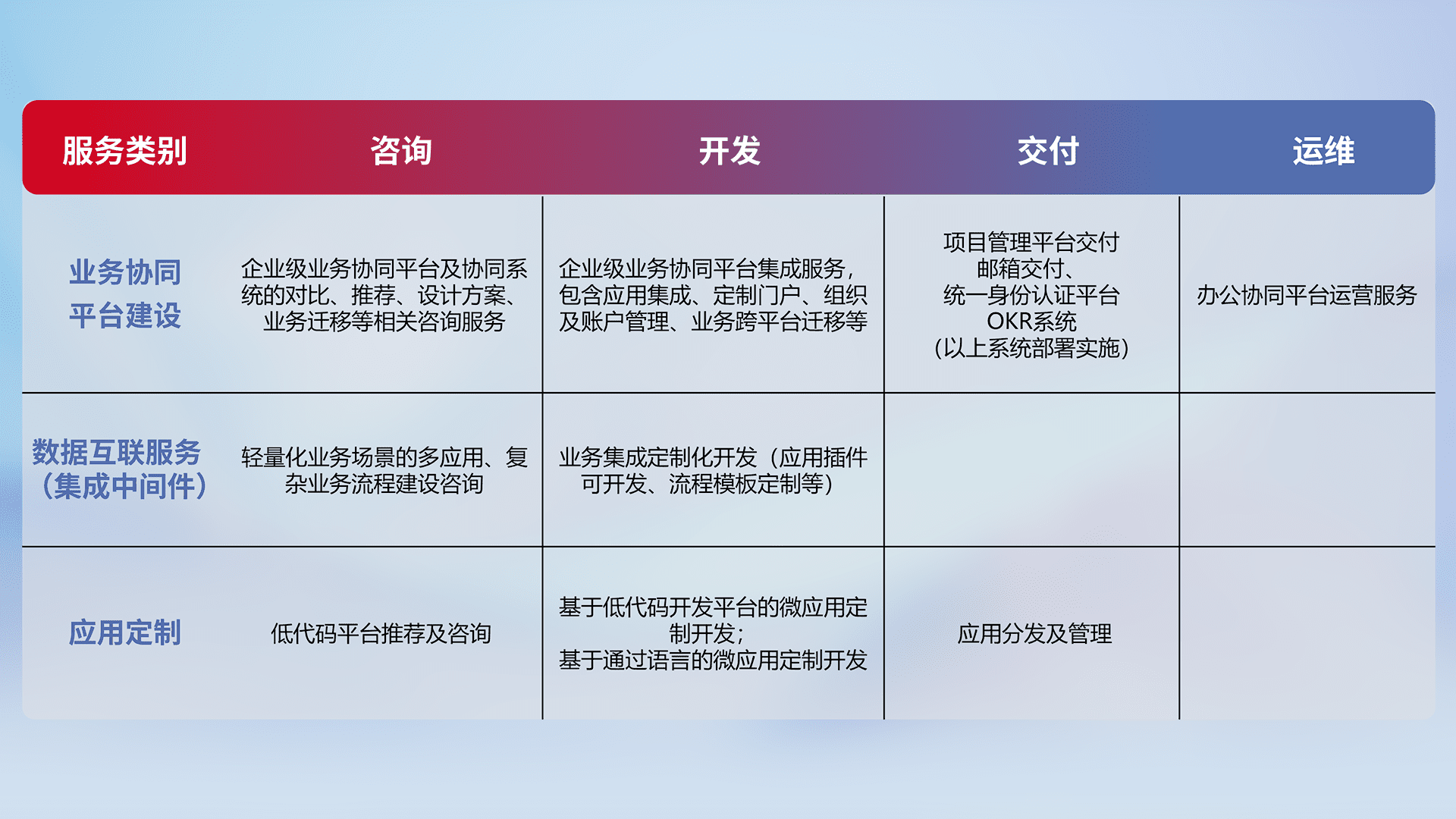 针对钉钉、、、、企微、、IDaas等平台级产品提供产品的规划、、方案、、交付、、定制化开发等服务,,实现如统一协同办公、、智能客户服务、、、混合会议管理、、、智能数据查询、、、等业务场景,,,,实现数字化转型。。。。